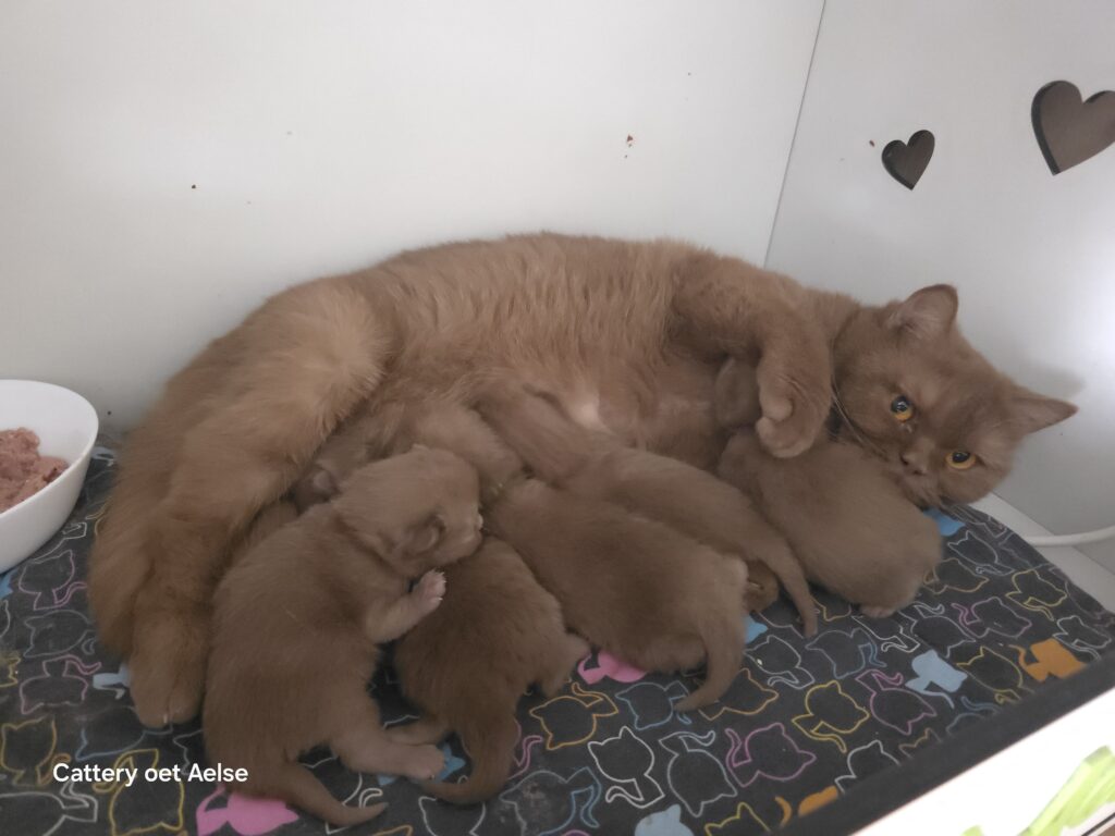 Alles is goed verlopen , ze heeft het weer fantastisch gedaan . Na ze klaar was en ze de kittens flink gewassen had zijn ze beginnen drinken bij haar. Tot nu gaat alles prima en zijn de gewichten al verdubbeld. Er zijn maar liefst 5 kittens geboren. Er zitten ook langhaartjes bij.